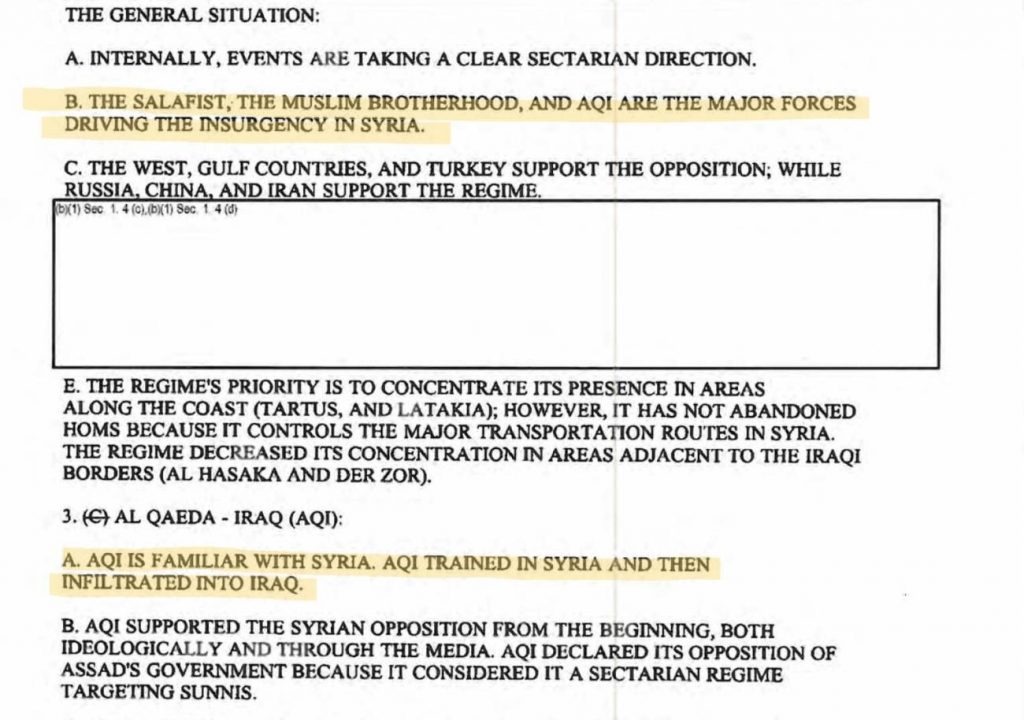 Twee jaar eerder voorspelde een rapport van de Defense Intelligence Agency uit 2012 dat er een ‘salafistisch vorstendom’ zou ontstaan in het oosten van Syrië en het westen van Irak, precies het gebied dat ISIS later zou controleren. Het rapport toont aan dat men op voorhand wist wat die proxy-oorlogen zouden veroorzaken.