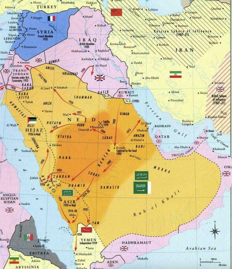 Ook de zionistische beweging werd aan het einde van de 19e eeuw door de meerderheid van de joden bestempeld als een antisemitische sekte. Zonder het Britse beheer van beide fanatieke bewegingen zou hun voortbestaan op lange termijn in gevaar zijn gekomen. De onderstaande kaart toont de uitbreiding van de invloed van Ibn Saud in Saoedi-Arabië tussen 1902 en 1932:
